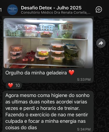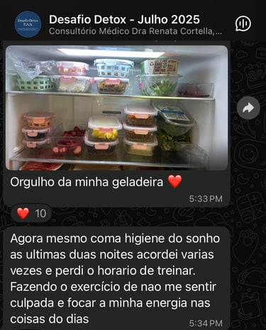 "Comprei o PAS no final de 2024 para fazer com minha avó e amamos desde a primeira aula, quando veio o desafio DETOX no meio do curso ficamos ainda mais empolgadas. Fiz tudo o que foi proposto pela Dra. Renata, sem negociações, mas com certa flexibilidade e posso garantir que foi muito além de uma evolução alimentar, com os exercícios propostos e as mentorias, consegui ter uma rotina mais leve (mesmo dentro da minha não-rotina de trabalho) e assim eliminar pesos não só do corpo físico. Agradeço e recomendo muito!" Tatiana Abrantes